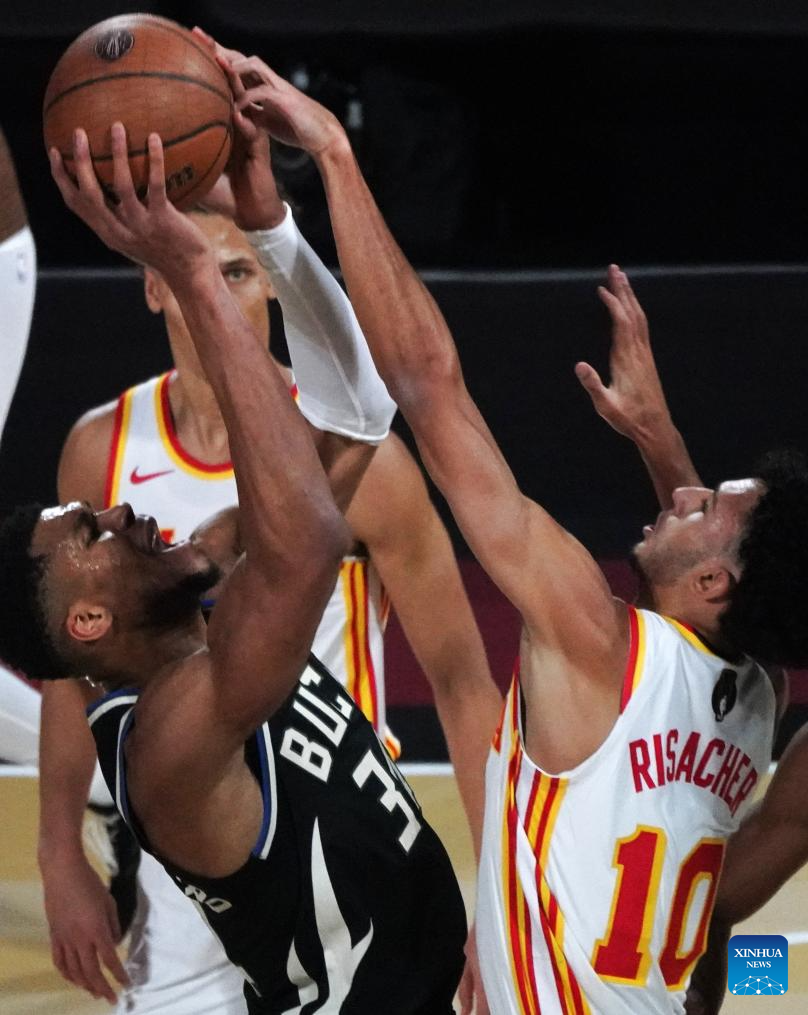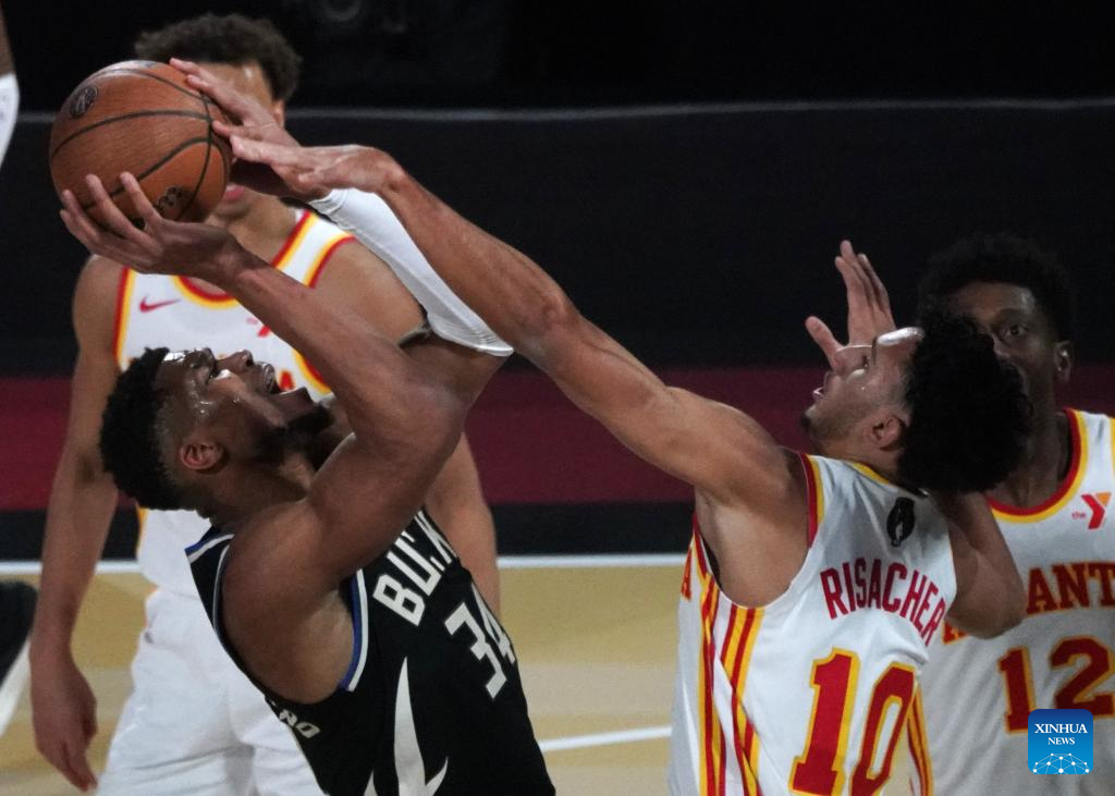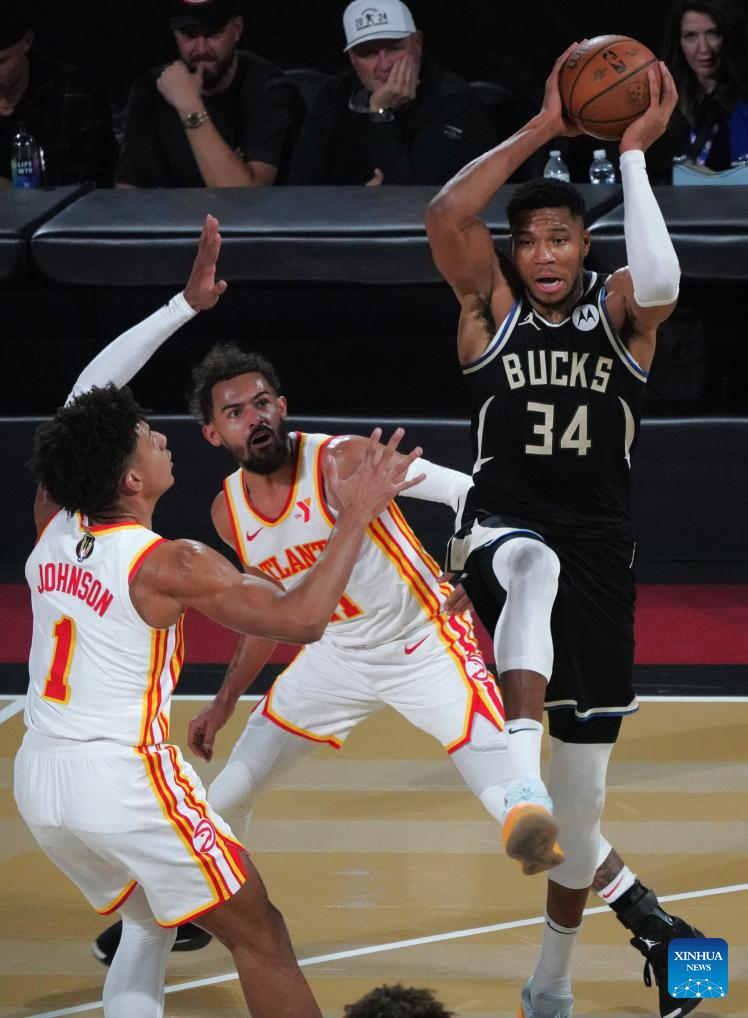 Giannis Antetokounmpo (L) of Milwaukee Bucks vies with Zaccharie Risacher (front R) of Atlanta Hawks during the 2024 NBA Cup semifinal match between Milwaukee Bucks and Atlanta Hawks in Las Vegas, the United States, Dec. 14, 2024. (Xinhua/Wu Xiaoling)