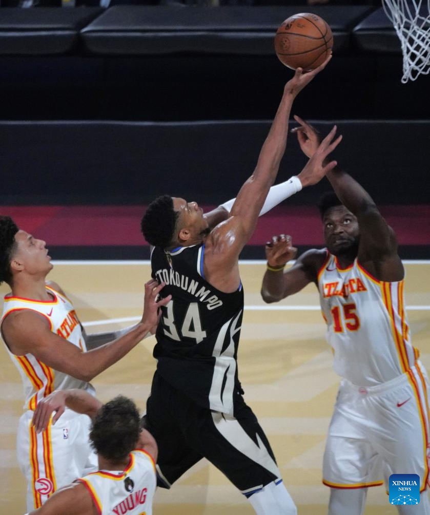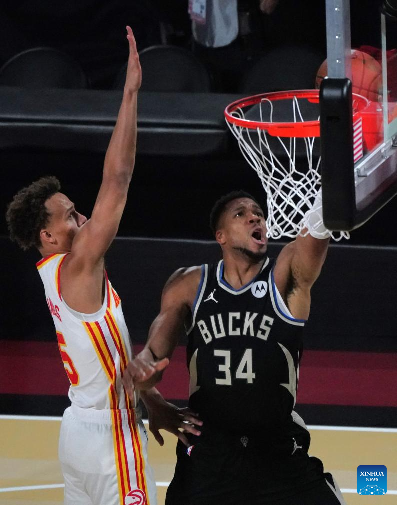 Giannis Antetokounmpo (R) of Milwaukee Bucks goes for the basket during the 2024 NBA Cup semifinal match between Milwaukee Bucks and Atlanta Hawks in Las Vegas, the United States, Dec. 14, 2024. (Xinhua/Wu Xiaoling)