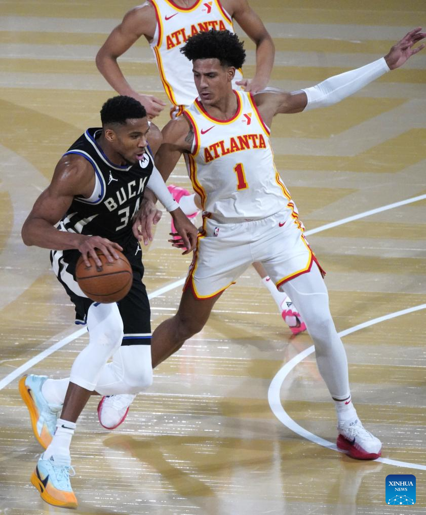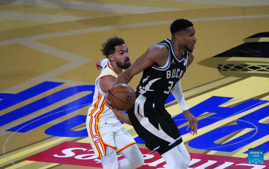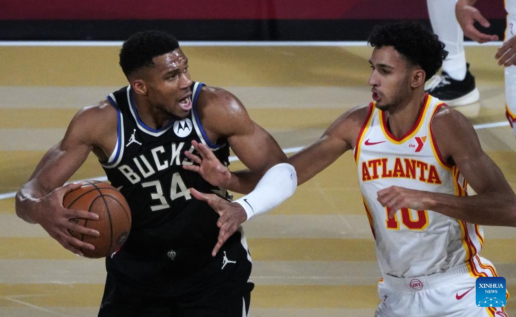 Giannis Antetokounmpo (R) of Milwaukee Bucks breaks through during the 2024 NBA Cup semifinal match between Milwaukee Bucks and Atlanta Hawks in Las Vegas, the United States, Dec. 14, 2024. (Xinhua/Wu Xiaoling)