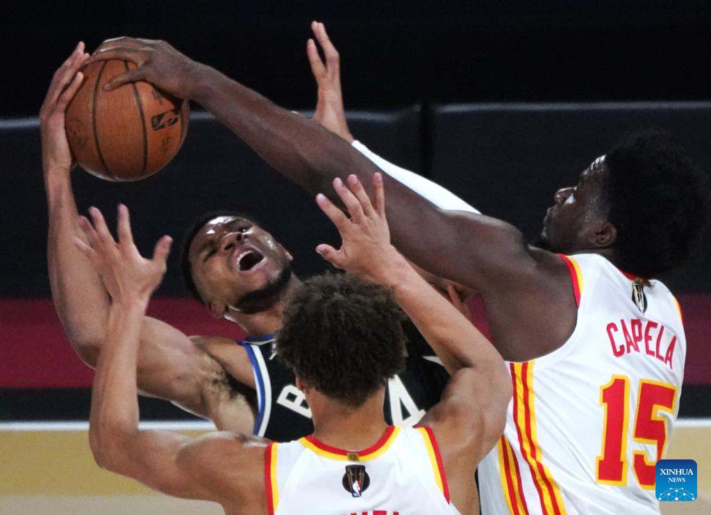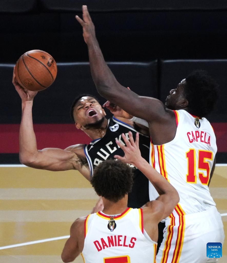 Giannis Antetokounmpo (L) of Milwaukee Bucks vies with Clint Capela (R) and Dyson Daniels of Atlanta Hawks during the 2024 NBA Cup semifinal match between Milwaukee Bucks and Atlanta Hawks in Las Vegas, the United States, Dec. 14, 2024. (Xinhua/Wu Xiaoling)