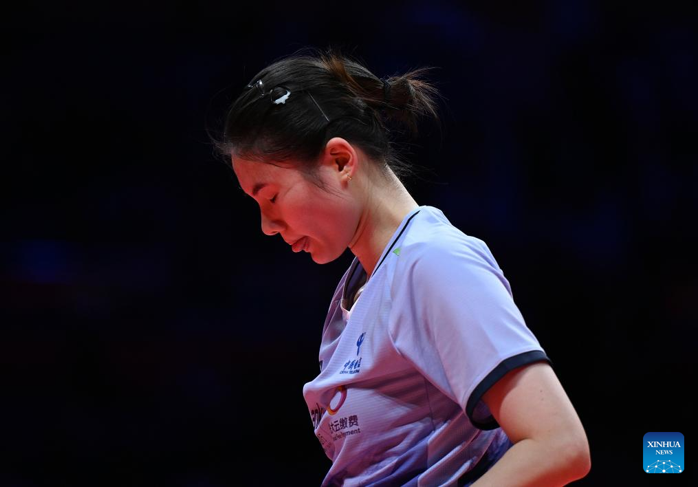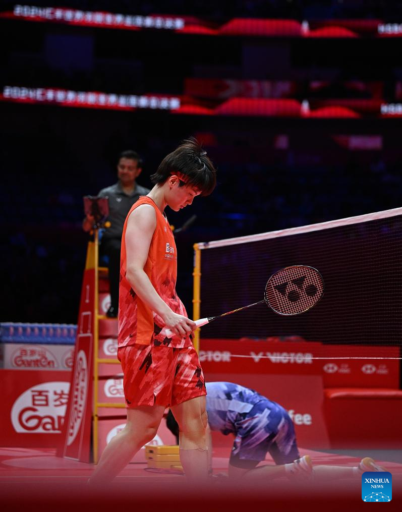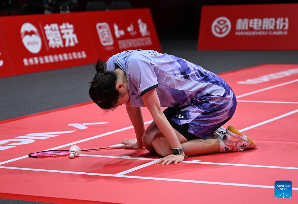 Han Yue looks dejected during the women's singles final match between Wang Zhiyi of China and Han Yue of China at BWF World Tour Finals 2024 in Hangzhou, China, Dec. 15, 2024. (Xinhua/Hou Zhaokang)