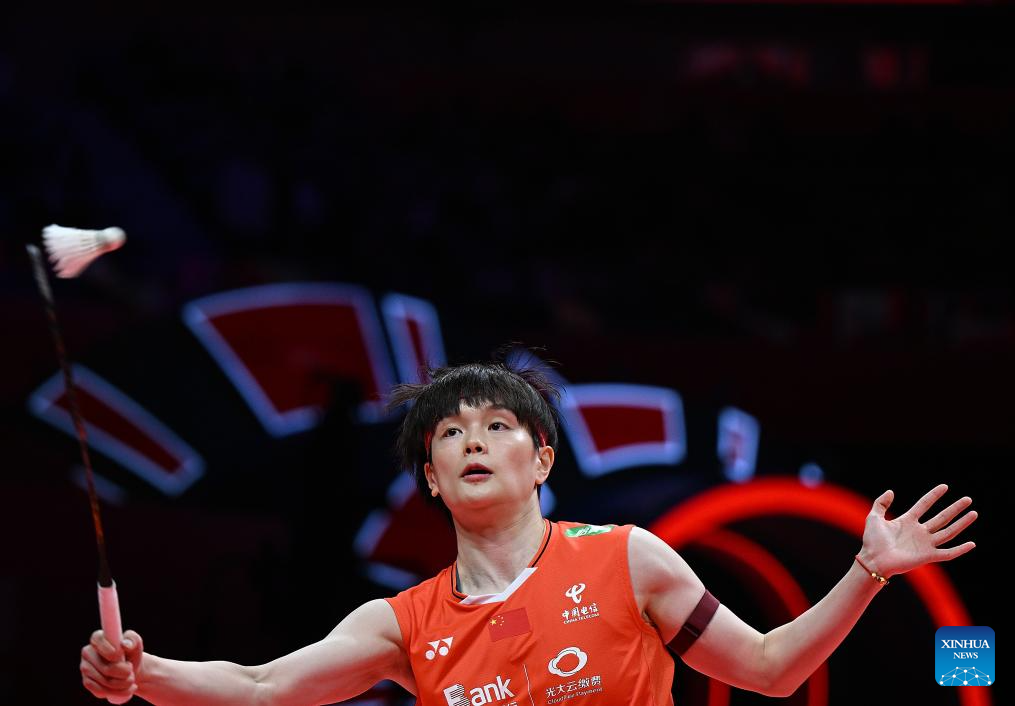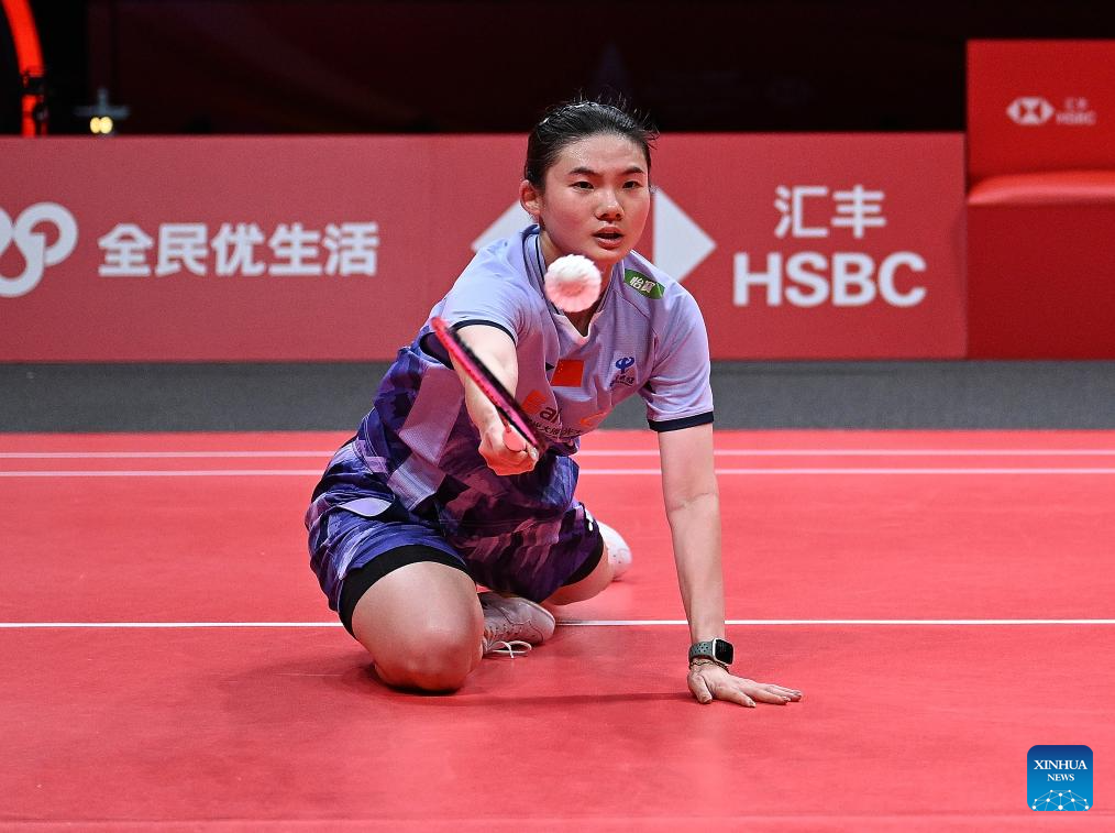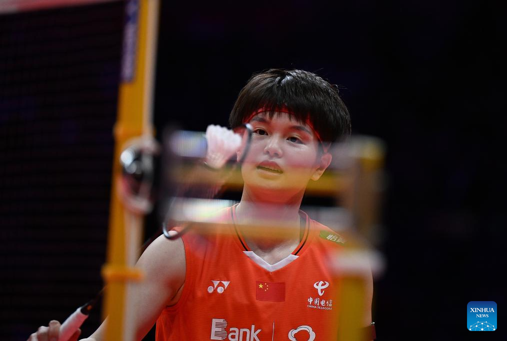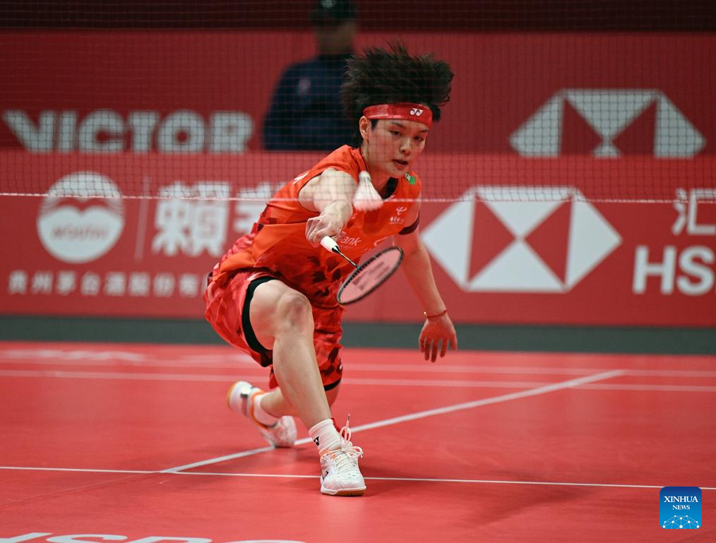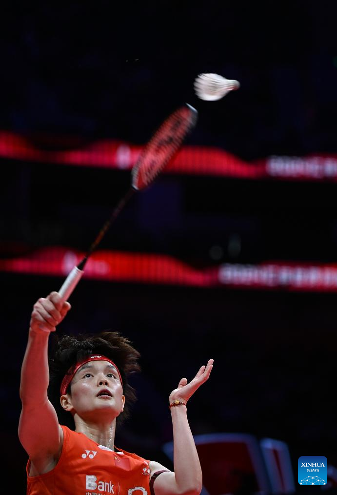 Han Yue hits a return during the women's singles final match between Wang Zhiyi of China and Han Yue of China at BWF World Tour Finals 2024 in Hangzhou, China, Dec. 15, 2024. (Xinhua/Hou Zhaokang)