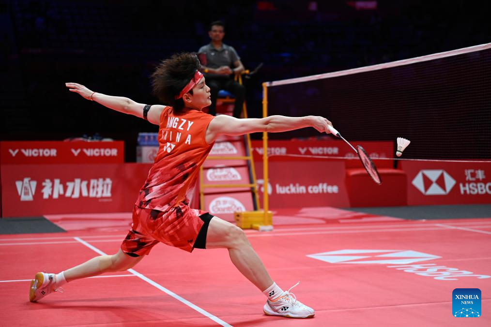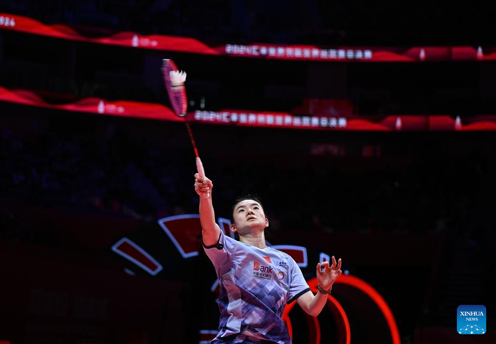 Wang Zhiyi hits a return during the women's singles final match between Wang Zhiyi of China and Han Yue of China at BWF World Tour Finals 2024 in Hangzhou, China, Dec. 15, 2024. (Xinhua/Hou Zhaokang)