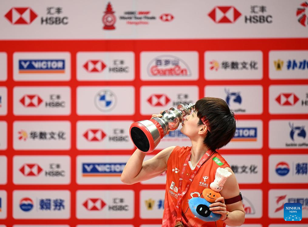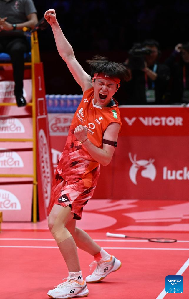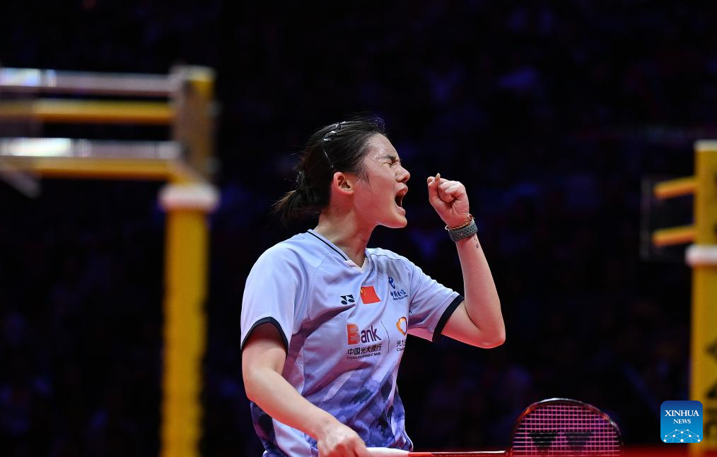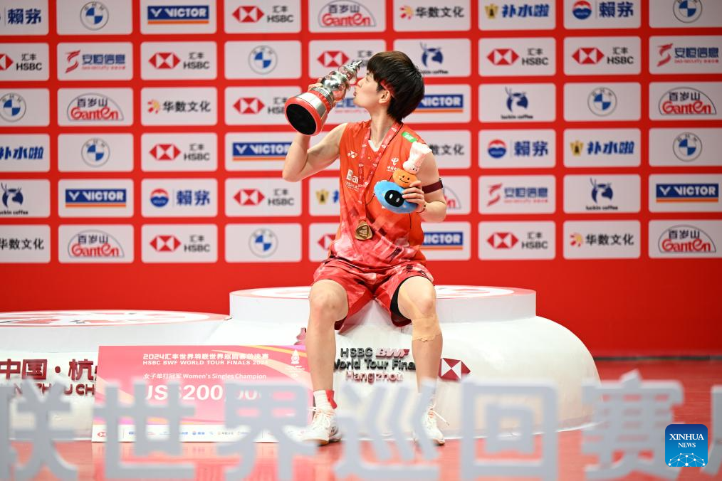 Wang Zhiyi celebrates victory after the women's singles final match between Wang Zhiyi of China and Han Yue of China at BWF World Tour Finals 2024 in Hangzhou, China, Dec. 15, 2024. (Xinhua/Hou Zhaokang)