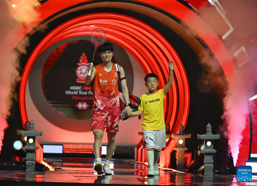 Wang Zhiyi walks into the court with a child before the women's singles final match between Wang Zhiyi of China and Han Yue of China at BWF World Tour Finals 2024 in Hangzhou, China, Dec. 15, 2024. (Xinhua/Hou Zhaokang)