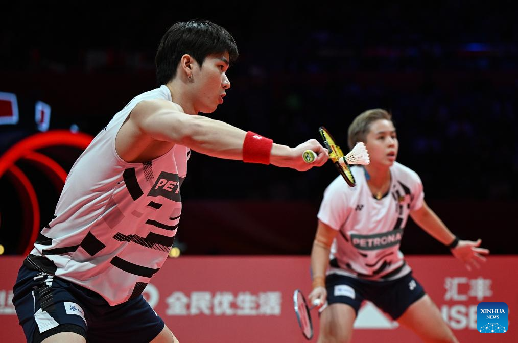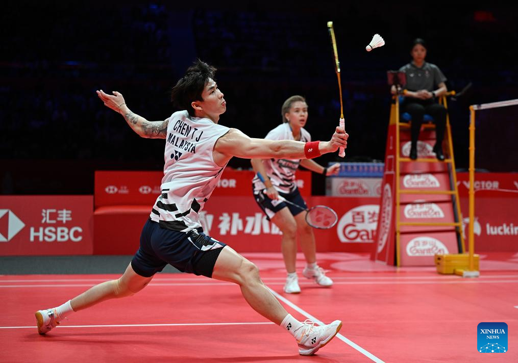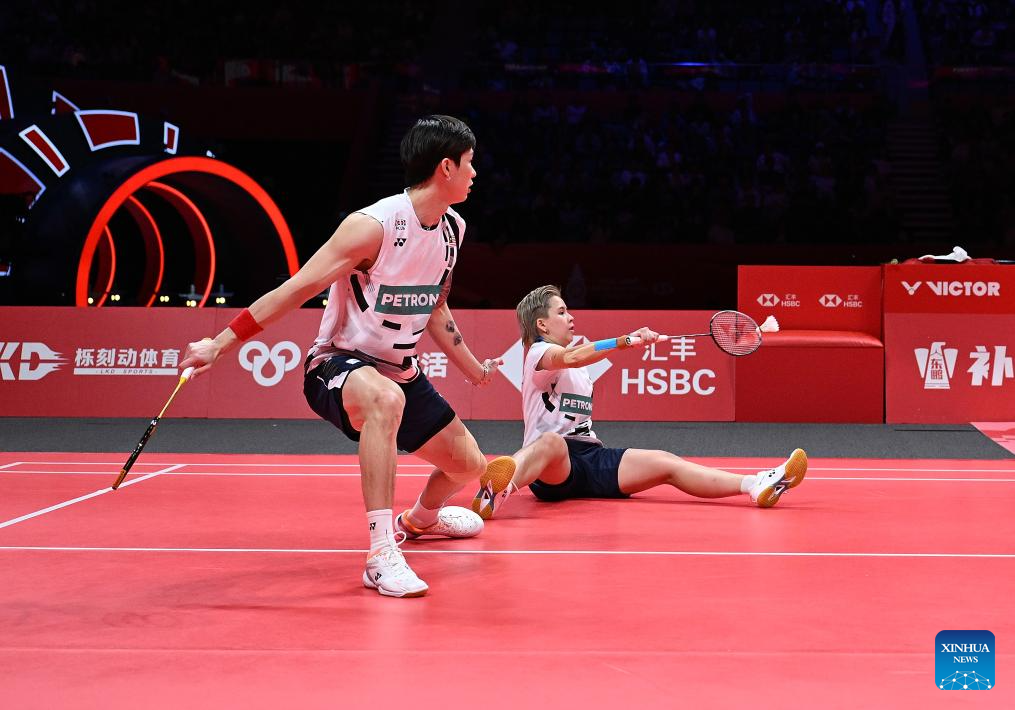 Chen Tang Jie (L)/Toh Ee Wei compete during the mixed doubles final match between Zheng Siwei/Huang Yaqiong of China and Chen Tang Jie/Toh Ee Wei of Malaysia at BWF World Tour Finals 2024 in Hangzhou, China, Dec. 15, 2024. (Xinhua/Hou Zhaokang)