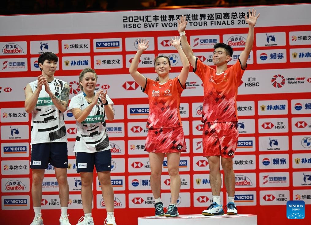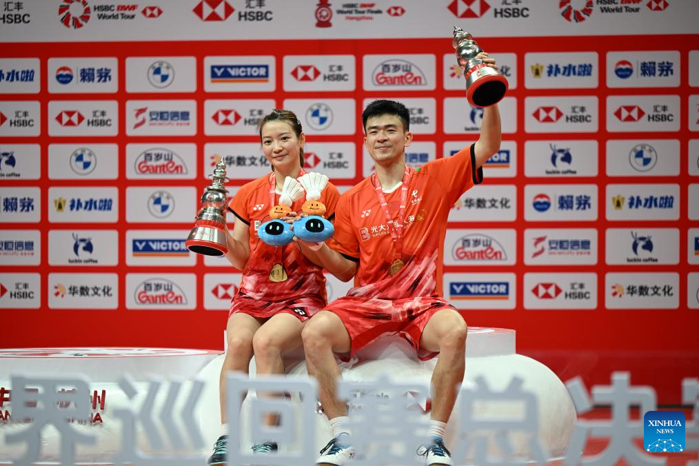 Winners Zheng Siwei (R)/Huang Yaqiong pose during the awarding ceremony for the mixed doubles event at BWF World Tour Finals 2024 in Hangzhou, China, Dec. 15, 2024.