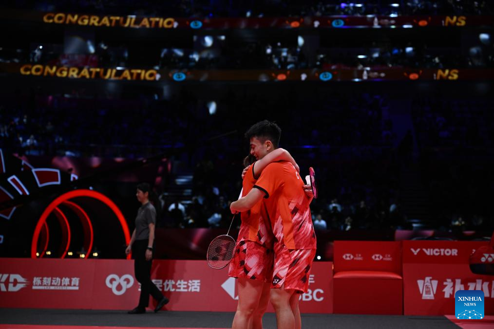 Zheng Siwei (R)/Huang Yaqiong embrace after winning the mixed doubles final match between Zheng Siwei/Huang Yaqiong of China and Chen Tang Jie/Toh Ee Wei of Malaysia at BWF World Tour Finals 2024 in Hangzhou, China, Dec. 15, 2024.