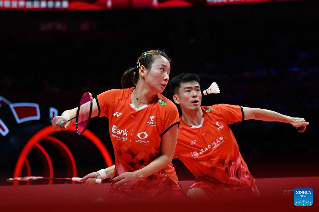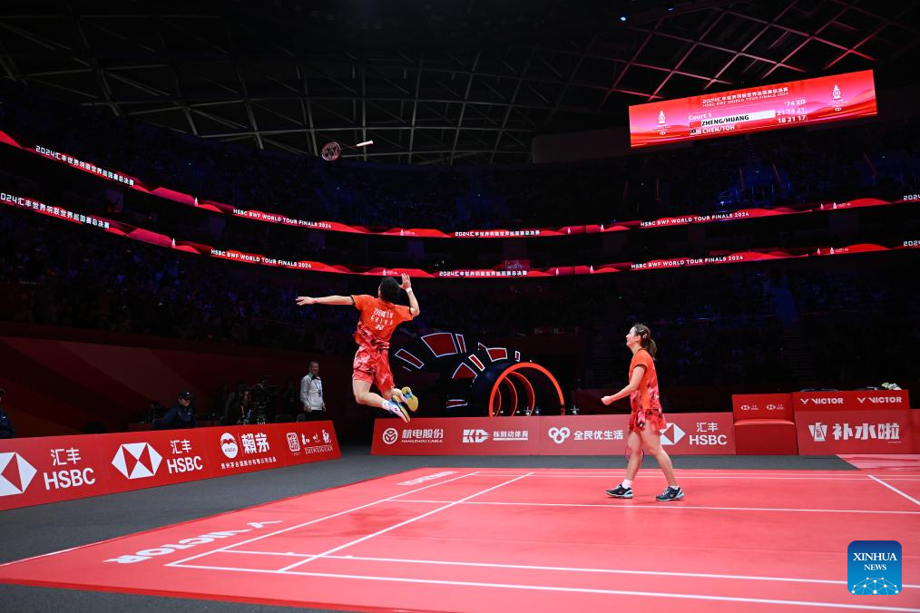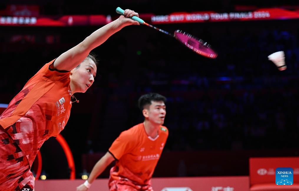Zheng Siwei (front)/Huang Yaqiong compete during the mixed doubles final match between Zheng Siwei/Huang Yaqiong of China and Chen Tang Jie/Toh Ee Wei of Malaysia at BWF World Tour Finals 2024 in Hangzhou, China, Dec. 15, 2024. (Xinhua/Hou Zhaokang)