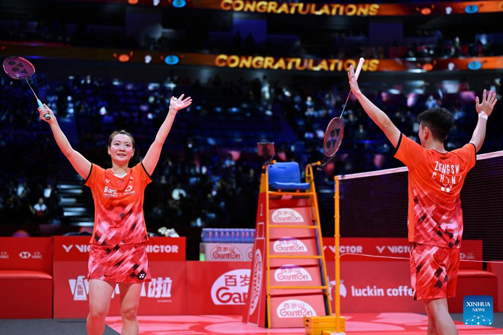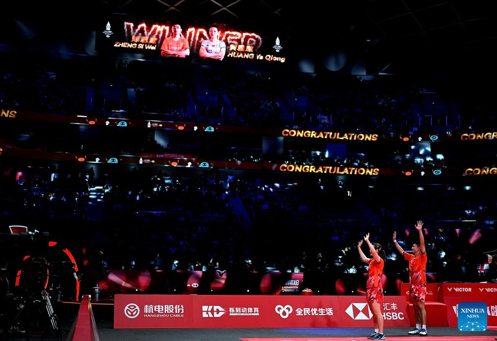 Zheng Siwei (R)/Huang Yaqiong greet spectators after winning the mixed doubles final match between Zheng Siwei/Huang Yaqiong of China and Chen Tang Jie/Toh Ee Wei of Malaysia at BWF World Tour Finals 2024 in Hangzhou, China, Dec. 15, 2024.