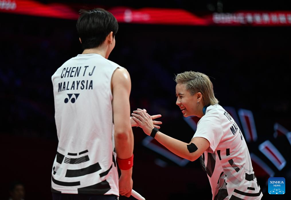 Chen Tang Jie/Toh Ee Wei (R) react during the mixed doubles final match between Zheng Siwei/Huang Yaqiong of China and Chen Tang Jie/Toh Ee Wei of Malaysia at BWF World Tour Finals 2024 in Hangzhou, China, Dec. 15, 2024. (Xinhua/Hou Zhaokang)
