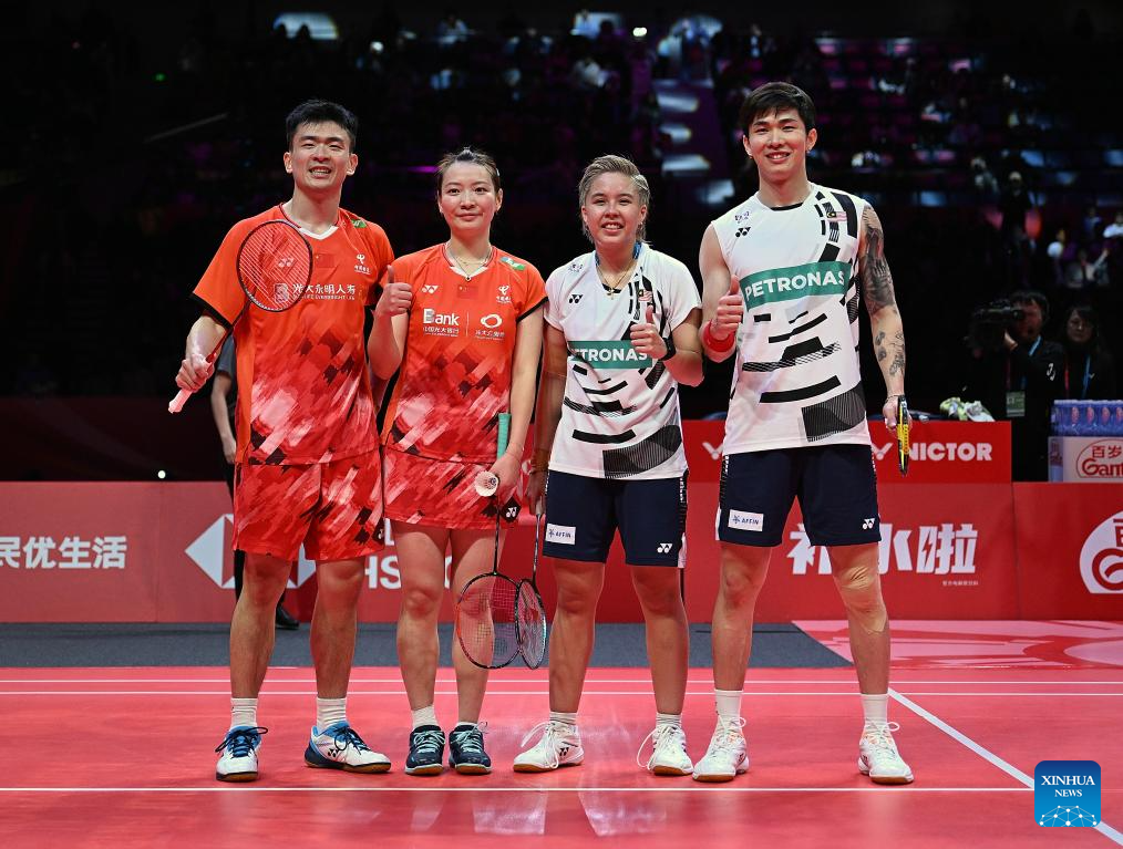 Winners Zheng Siwei (1st L)/Huang Yaqiong (2nd L) of China and runners-up Chen Tang Jie (1st R)/Toh Ee Wei of Malaysia pose for photos after their mixed doubles final match at BWF World Tour Finals 2024 in Hangzhou, China, Dec. 15, 2024. (Xinhua/Hou Zhaokang)