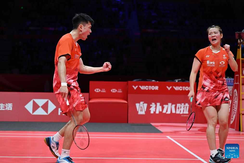 Zheng Siwei (L)/Huang Yaqiong celebrate after winning the mixed doubles final match between Zheng Siwei/Huang Yaqiong of China and Chen Tang Jie/Toh Ee Wei of Malaysia at BWF World Tour Finals 2024 in Hangzhou, China, Dec. 15, 2024.