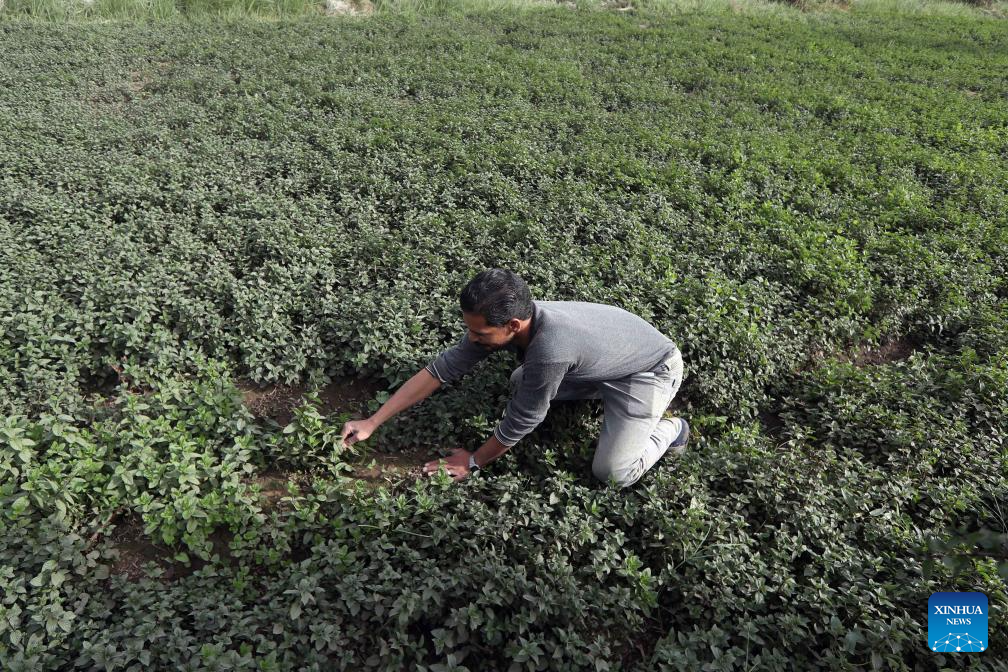 A farmer picks mints at a field in Fayoum, Egypt, on Dec. 9, 2024. (Xinhua/Ahmed Gomaa)