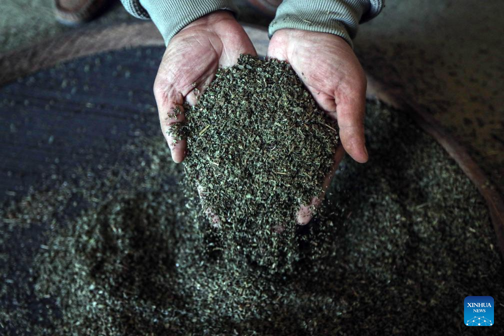 A farmer airs medicinal herbs at a field in Fayoum, Egypt, on Dec. 9, 2024. (Xinhua/Ahmed Gomaa)