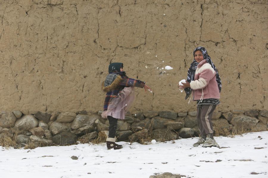 Children play with snow in Paghman District, Kabul, capital of Afghanistan, Dec. 16, 2024. (Photo by Saifurahman Safi/Xinhua)