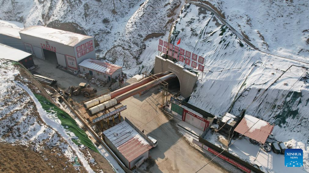 An aerial drone photo taken on Dec. 17, 2024 shows the No. 2 shaft of the Kaole Tunnel of Lanzhou-Hezuo high-speed railway under construction in Linxia Hui Autonomous Prefecture, northwest China's Gansu Province.