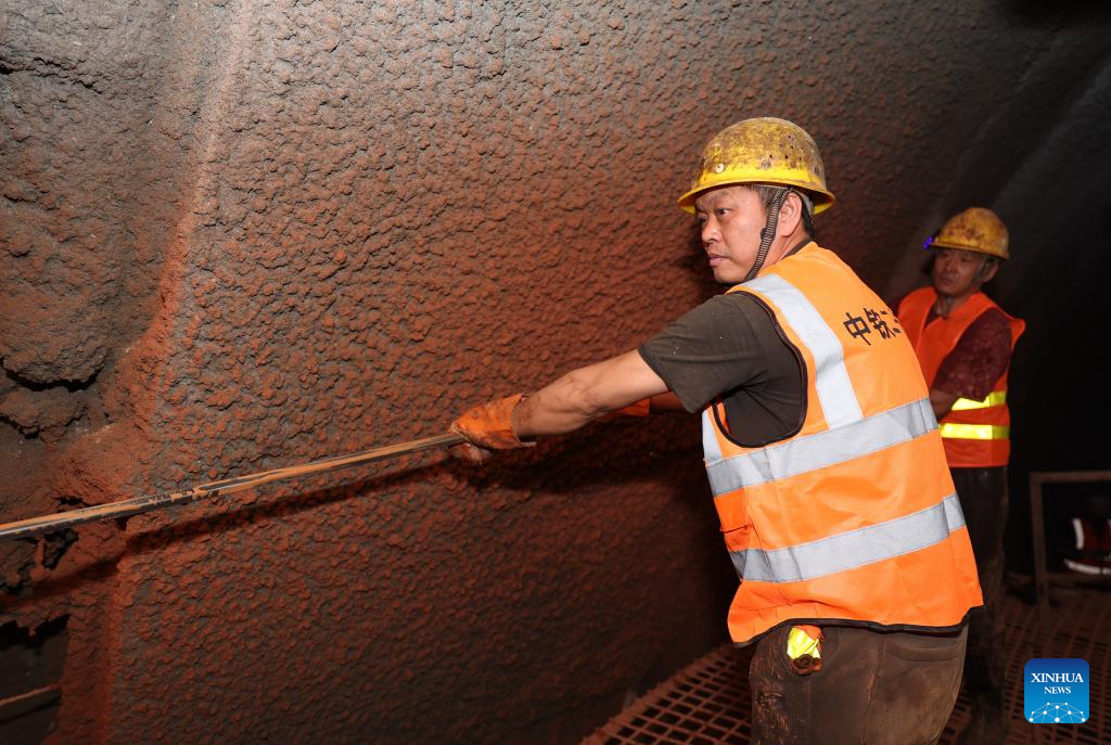 The tunnel has a total length of 14,659 meters, of which 11,000 meters have been drilled through by Tuesday. It is a key project of Lanzhou-Hezuo high-speed railway, a part of China's high-speed rail network that centers around eight main vertical lines linking the north and south and eight horizontal lines connecting the east and west. (Xinhua/Chen Bin)