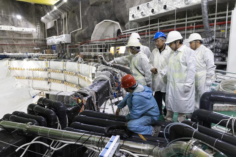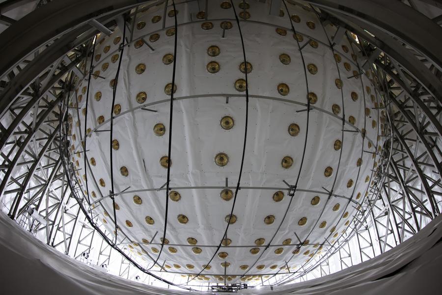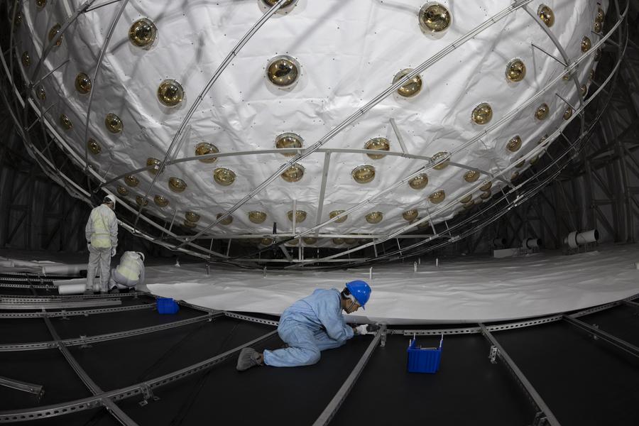 Wang Yifang (2nd R), chief scientist of the Jiangmen Underground Neutrino Observatory (JUNO), and Ma Xiaoyan (4th R), chief engineer of the JUNO, check the status of liquid filling of JUNO in Jiangmen, south China's Guangdong Province, Dec. 18, 2024. (Xinhua/Jin Liwang)This photo taken on Dec. 17, 2024 shows photo-multiplier tubes inside the acrylic sphere of the Jiangmen Underground Neutrino Observatory (JUNO) in Jiangmen, south China's Guangdong Province. (Xinhua/Jin Liwang)Staff members seal the bottom of a water tank with Tyvek material at the construction site of the Jiangmen Underground Neutrino Observatory (JUNO) in Jiangmen, south China's Guangdong Province, Dec. 16, 2024. (Xinhua/Jin Liwang)This photo taken on Dec. 17, 2024 shows photo-multiplier tubes seen from the top of the acrylic sphere of the Jiangmen Underground Neutrino Observatory (JUNO) in Jiangmen, south China's Guangdong Province. (Xinhua/Jin Liwang)Wang Yifang (L), chief scientist of the Jiangmen Underground Neutrino Observatory (JUNO), and Ma Xiaoyan, chief engineer of the JUNO, inspect the construction site at the bottom of a water tank of JUNO in Jiangmen, south China's Guangdong Province, Dec. 16, 2024. (Xinhua/Jin Liwang)This photo taken on Dec. 16, 2024 shows the central detector of the Jiangmen Underground Neutrino Observatory (JUNO) in Jiangmen, south China's Guangdong Province. (Xinhua/Jin Liwang)Ma Xiaoyan, chief engineer of the Jiangmen Underground Neutrino Observatory (JUNO), checks the bottom of a water tank of the JUNO in Jiangmen, south China's Guangdong Province, Dec. 16, 2024. (Xinhua/Jin Liwang)Ma Xiaoyan, chief engineer of the Jiangmen Underground Neutrino Observatory (JUNO), inspects the construction site of JUNO in Jiangmen, south China's Guangdong Province, Dec. 17, 2024. (Xinhua/Jin Liwang)Researchers pose for a group photo to mark the start of liquid filling at the Jiangmen Underground Neutrino Observatory (JUNO) in Jiangmen, south China's Guangdong Province, Dec. 18, 2024. (Xinhua/Jin Liwang)Staff members seal the bottom of a water tank with Tyvek material at the construction site of the Jiangmen Underground Neutrino Observatory (JUNO) in Jiangmen, south China's Guangdong Province, Dec. 16, 2024. (Xinhua/Jin Liwang)■