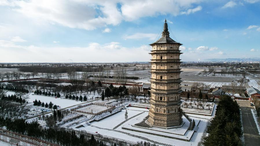 An aerial drone photo taken on Dec. 20, 2024 shows the White Pagoda in Saihan District of Hohhot City, north China's Inner Mongolia Autonomous Region. (Xinhua/Li Zhipeng)