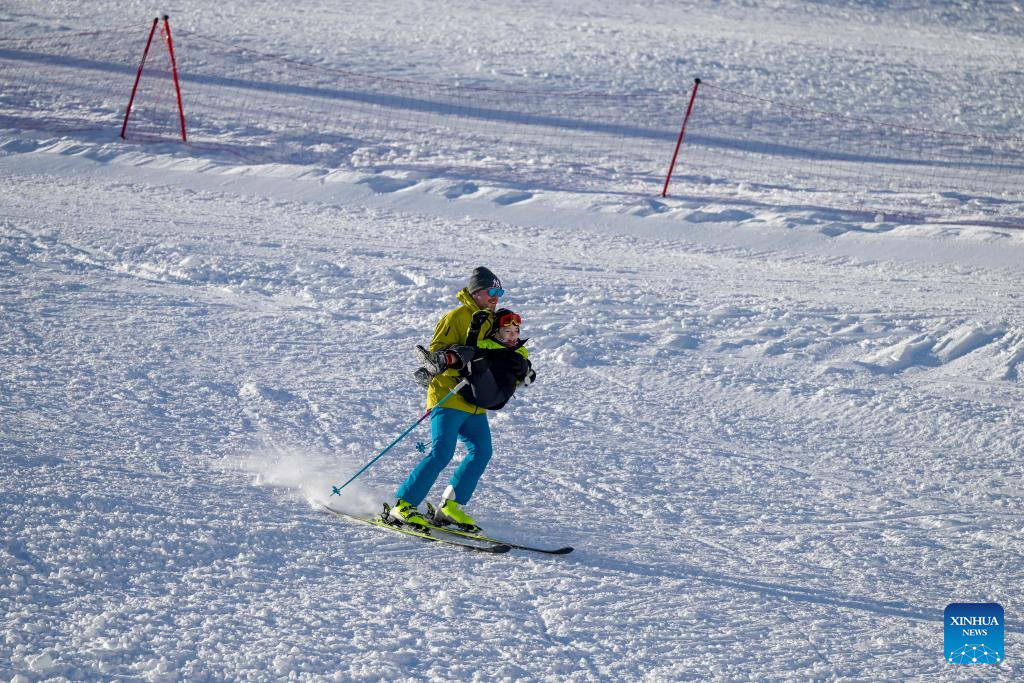 A man holding a child skis at the Popova Sapka Ski Center, some 60 kilometers west of Skopje, North Macedonia, Dec. 22, 2024. (Photo by Tomislav Georgiev/Xinhua)