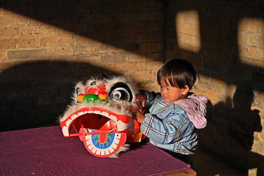 A kid touches the headgear for the lion dance at Longteng Hamlet, Na'an Village in Tongmu Town of Jinxiu Yao Autonomous County, south China's Guangxi Zhuang Autonomous Region, Dec. 19, 2024. (Xinhua/Zhou Hua)