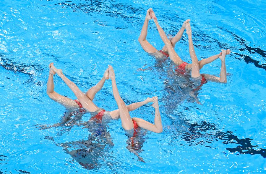For instance, eight swimmers formed the oracle bone script character for "mountain" with their bodies, symbolizing their ambition and resilience. In the duet competition, lotus leaf patterns on their costumes and fluid movements illustrated the aesthetics of traditional Chinese painting.