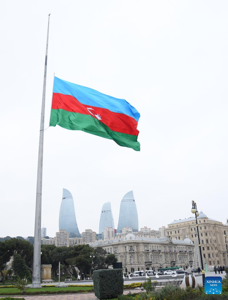 Azerbaijan's national flag flies at half-mast to mourn the victims of the tragic crash of an Embraer 190 passenger plane in Baku, Azerbaijan, on Dec. 26, 2024. Azerbaijan has declared Thursday a national day of mourning for the victims of the tragic crash of an Embraer 190 passenger plane operating a Baku-Grozny flight. (Photo by Humbet Mammadov/Xinhua)