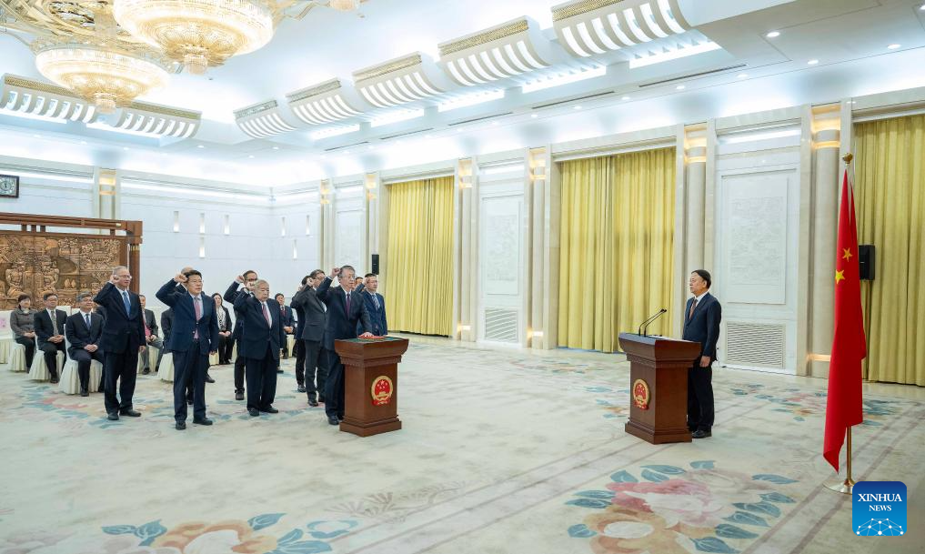 Wu Weihua, vice chairman of the Standing Committee of the 14th National People's Congress (NPC), chairs and oversees an oath-taking ceremony held by the 14th NPC Standing Committee to pledge allegiance to the Constitution at the Great Hall of the People in Beijing, capital of China, Dec. 25, 2024. (Xinhua/Li Tao)