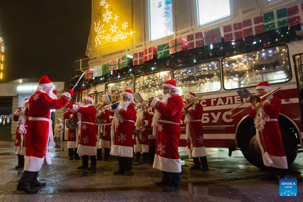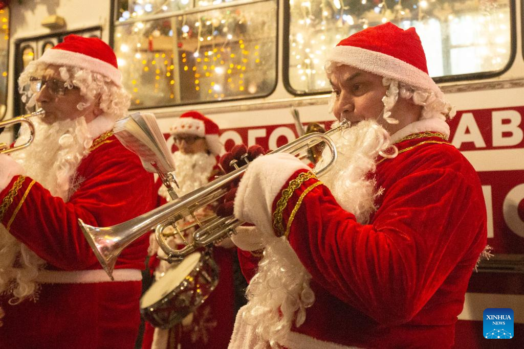 Musicians in Father Frost costumes play music for citizens in St. Petersburg, Russia, Dec. 25, 2024. Musicians in holiday costumes took a holiday bus around the Russian city to play music and distribute gifts to citizens in celebration of the upcoming New Year. (Photo by Irina Motina/Xinhua)
