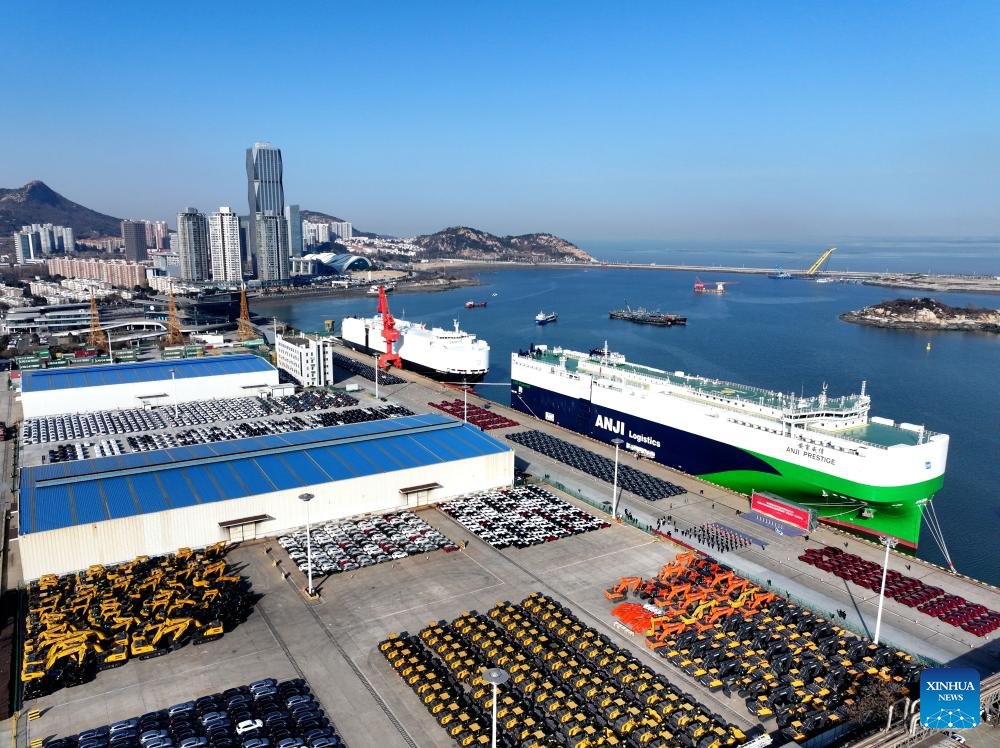 An aerial drone photo taken on Dec. 27, 2024 shows vehicles to be loaded for export at Lianyungang Port, east China's Jiangsu Province. (Photo by Wang Chun/Xinhua)