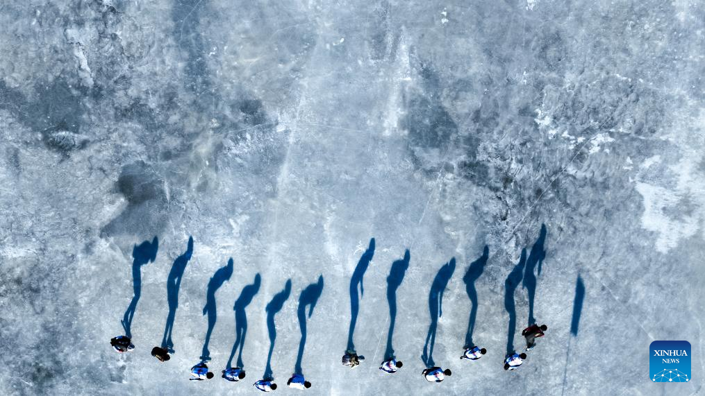 An aerial drone photo taken on Dec. 27, 2024 shows people performing during a winter fishing event on the frozen Lianhuan Lake in Mongolian Autonomous County of Dorbod, Daqing City, northeast China's Heilongjiang Province. The winter fishing event in Heilongjiang Province, featuring a series of activities, kicked off here on Friday and will last until Feb. 14 the next year. (Photo by Yuan Yong/Xinhua)