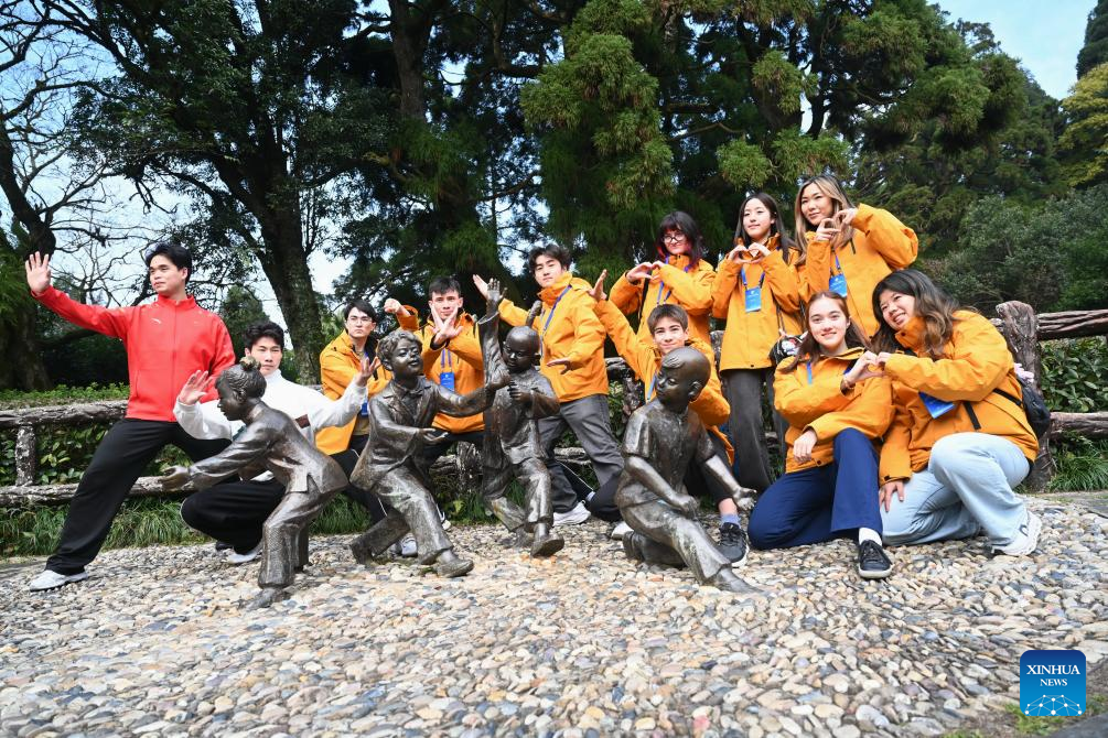 Participants of a Chinese martial arts cultural exchange event pose for photos at a park in Kuliang, Fuzhou, southeast China's Fujian Province, Dec. 27, 2024. The Chinese martial arts cultural exchange event of American and Chinese young people kicked off here on Friday. (Xinhua/Lin Shanchuan)