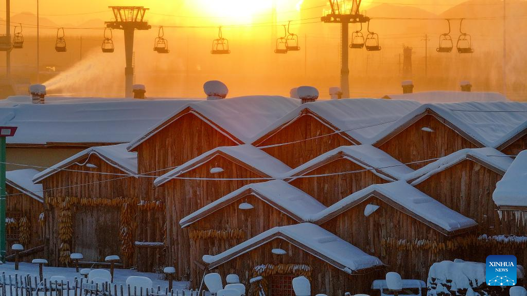 An aerial drone photo taken on Dec. 27, 2024 shows the scenery at dawn in a snow village scenic spot in Tuanpiaozhuang Township of Zunhua, north China's Hebei Province. (Photo by Liu Mancang/Xinhua)
