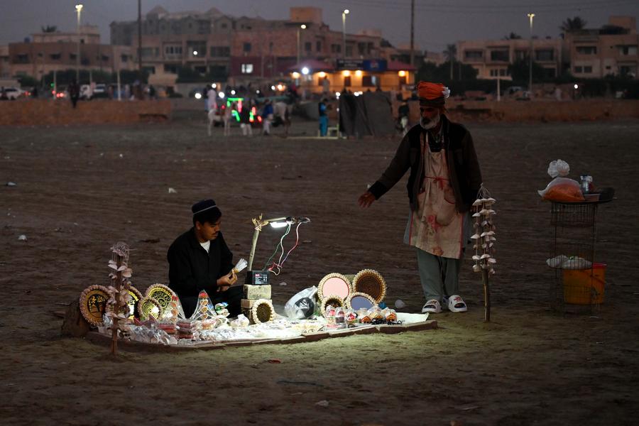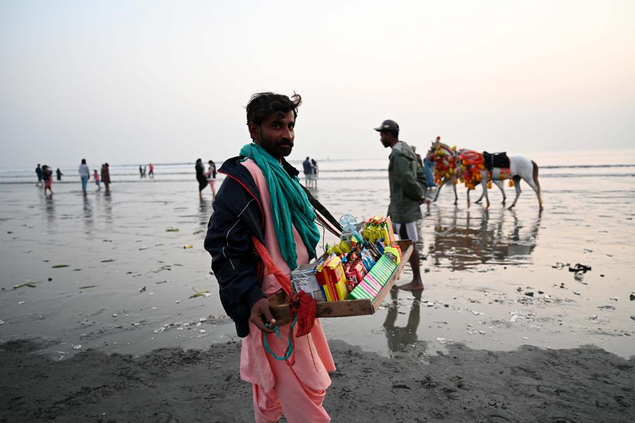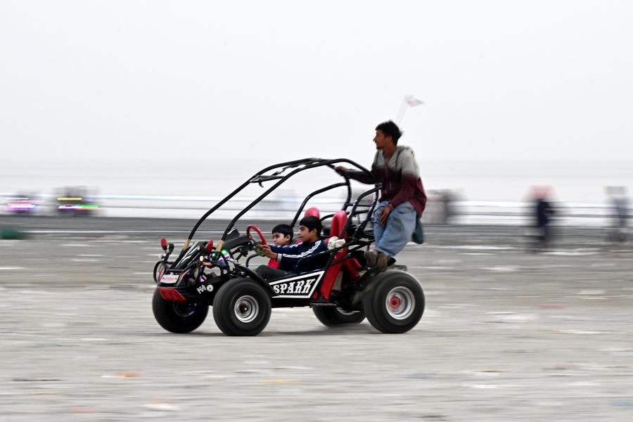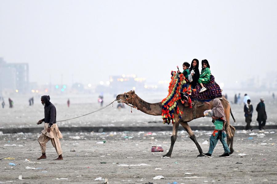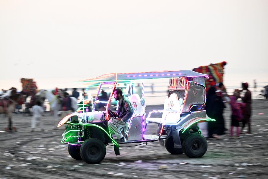 A vendor sells snacks on a beach in southern Pakistani port city of Karachi on Dec. 26, 2024. (Xinhua/Ahmad Kamal)A man drives an electric vehicle on a beach in southern Pakistani port city of Karachi on Dec. 26, 2024. (Xinhua/Ahmad Kamal)Boys ride on an electric vehicle on a beach in southern Pakistani port city of Karachi on Dec. 26, 2024. (Xinhua/Ahmad Kamal)Children enjoy a camel ride on a beach in southern Pakistani port city of Karachi on Dec. 26, 2024. (Xinhua/Ahmad Kamal)A vendor sells decoration items made with seashells on a beach in southern Pakistani port city of Karachi on Dec. 26, 2024. (Xinhua/Ahmad Kamal)■