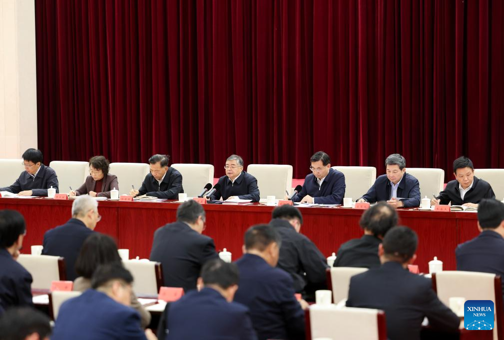 Li Shulei, a member of the Political Bureau of the Communist Party of China (CPC) Central Committee and head of the Publicity Department of the CPC Central Committee, attends a symposium to discuss a newly published outline for studying Xi Jinping Thought on Culture in Beijing, capital of China, Dec. 30, 2024. (Xinhua/Ding Haitao)