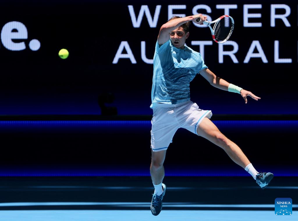 Alexander Shevchenko of Kazakhstan hits a return during the men's singles match against Stefanos Tsitsipas of Greece in the Group C round robin match between Greece and Kazakhstan at the 2025 United Cup tennis tournament in Perth, Australia, Dec. 30, 2024. (Photo by Zhou Dan/Xinhua)