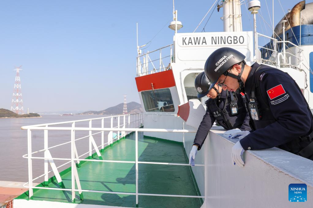 Immigration administration police officers conduct security check aboard Kawa Ningbo, the first cargo ship that will sail on the Ningbo-Wilhelmshaven direct route, at Ningbo Zhoushan Port in Ningbo, east China's Zhejiang Province, Dec. 30, 2024. This ship loaded with over 1,700 TEU containers of lithium batteries and e-commerce goods set sail on Monday from east China's Ningbo port for Wilhelmshaven in Germany, marking the opening of a "China-Europe express" shipping route.