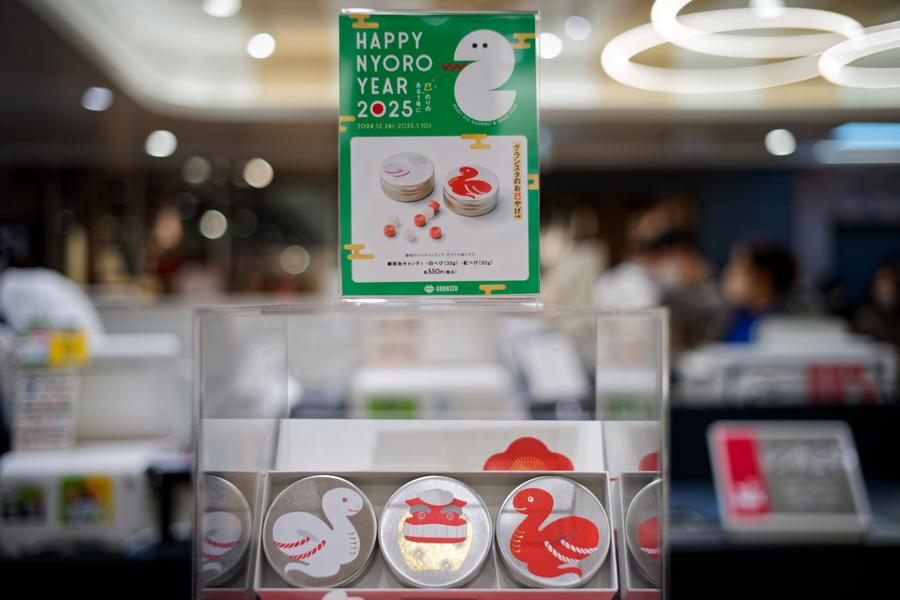 This photo taken on Dec. 27, 2024 shows candy boxes with snake elements at a station in Tokyo, Japan. (Xinhua/Zhang Xiaoyu)