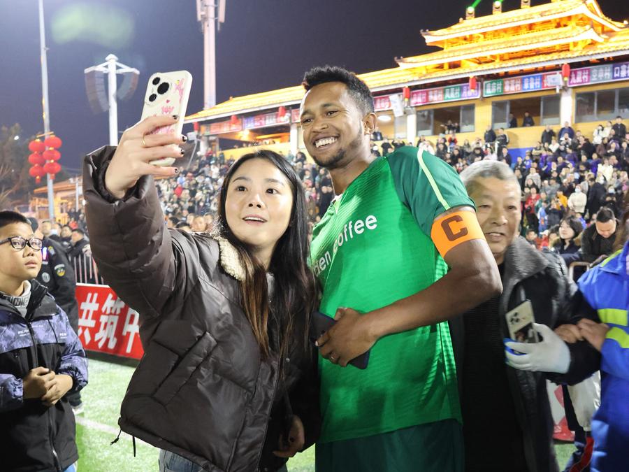 Degu, captain of an Ethiopian football team, led his squad to Rongjiang County in southwest China's Guizhou Province to participate in a football invitational event with Chinese counterparts on Tuesday night.
