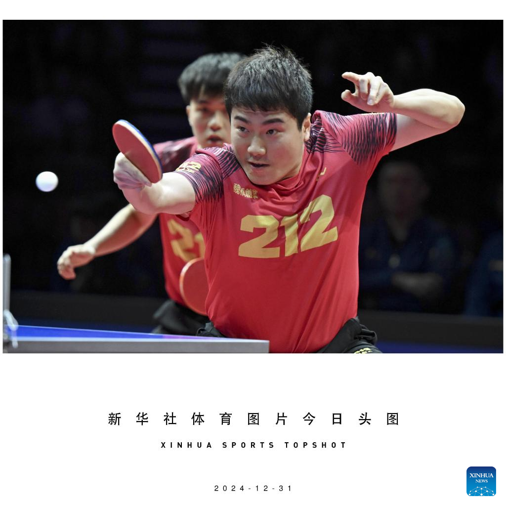 Lin Yunru/Liang Jingkun (R) of Shandong Weiqiao compete against Xu Xin/Zhou Kai of Shanghai during the men's team semifinal at the 2024 Chinese Table Tennis Super League (CTTSL) in east China's Shanghai, Dec. 31, 2024. (Photo by Chen Haoming/Xinhua)