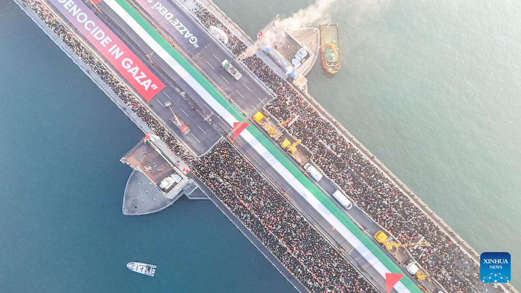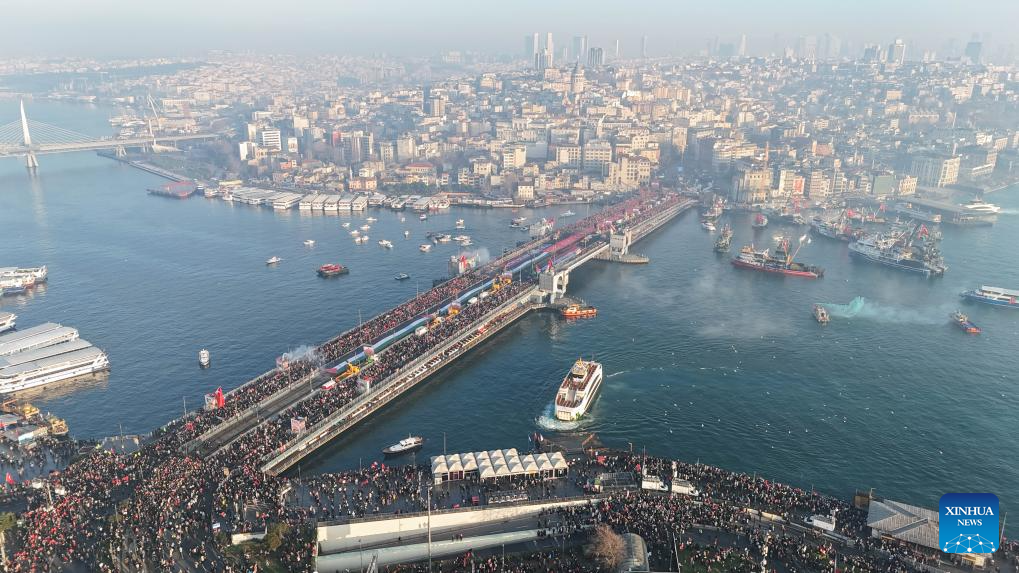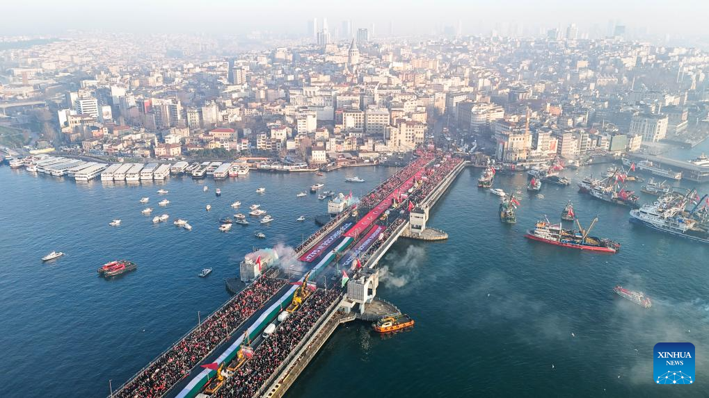 An aerial drone photo taken on Jan. 1, 2025 shows a rally in support of Palestinian people in Istanbul, Türkiye. Tens of thousands of people gathered Wednesday in Istanbul, Türkiye's largest city, to denounce the ongoing oppression in Gaza and express their solidarity with the Palestinian people. (Xinhua/Liu Lei)