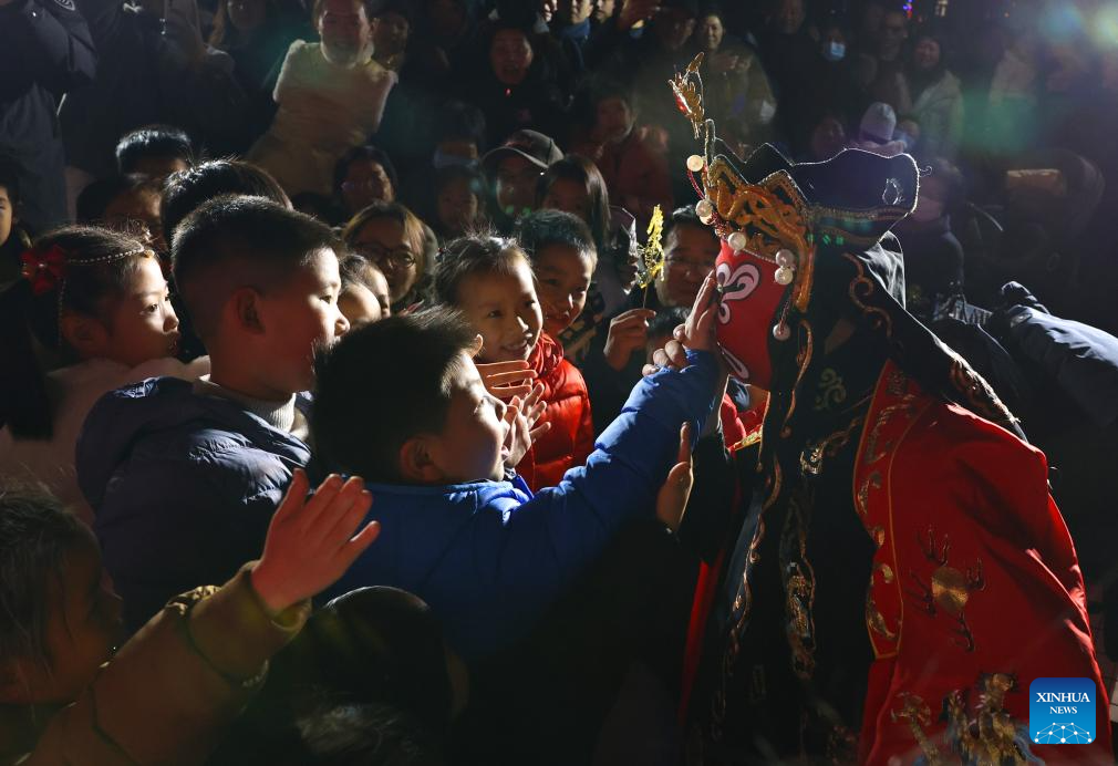 A child interacts with an actor performing Bianlian or face-changing, a part of the Sichuan opera, during an event welcoming the New Year at a community in Huangpu District of east China's Shanghai, Dec. 31, 2024. (Xinhua/Fang Zhe)