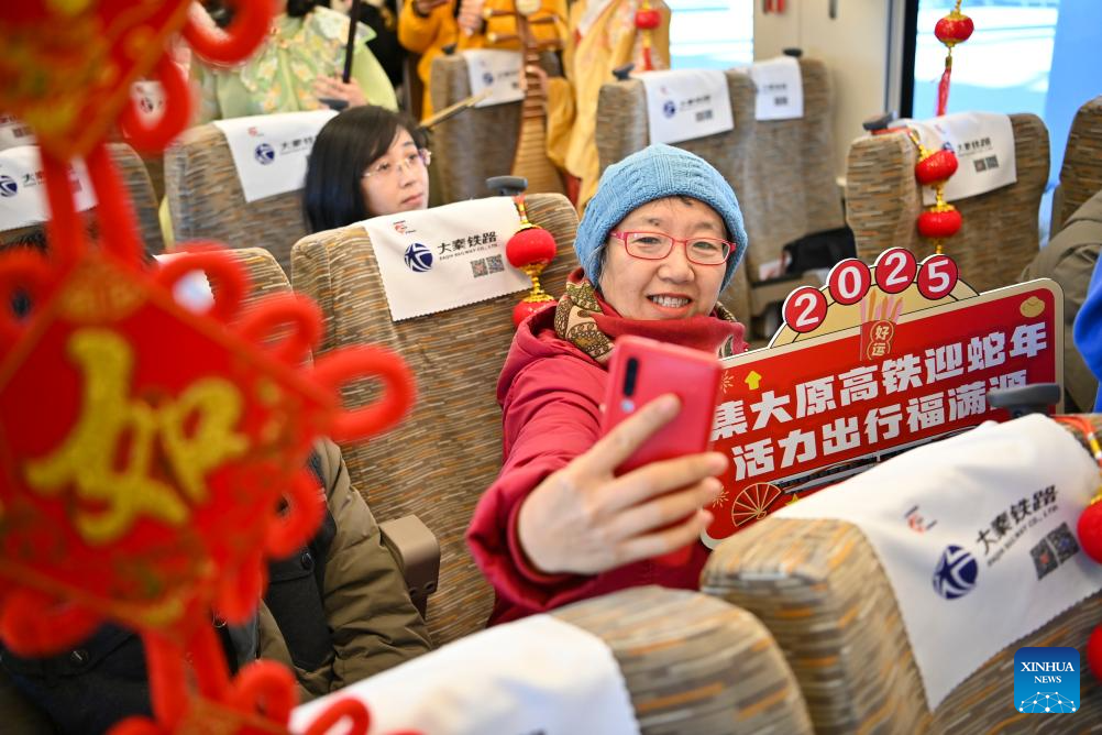 A passenger takes selfies aboard the bullet train G4408 on the Jining-Datong-Yuanping high-speed railway, Dec. 31, 2024.
