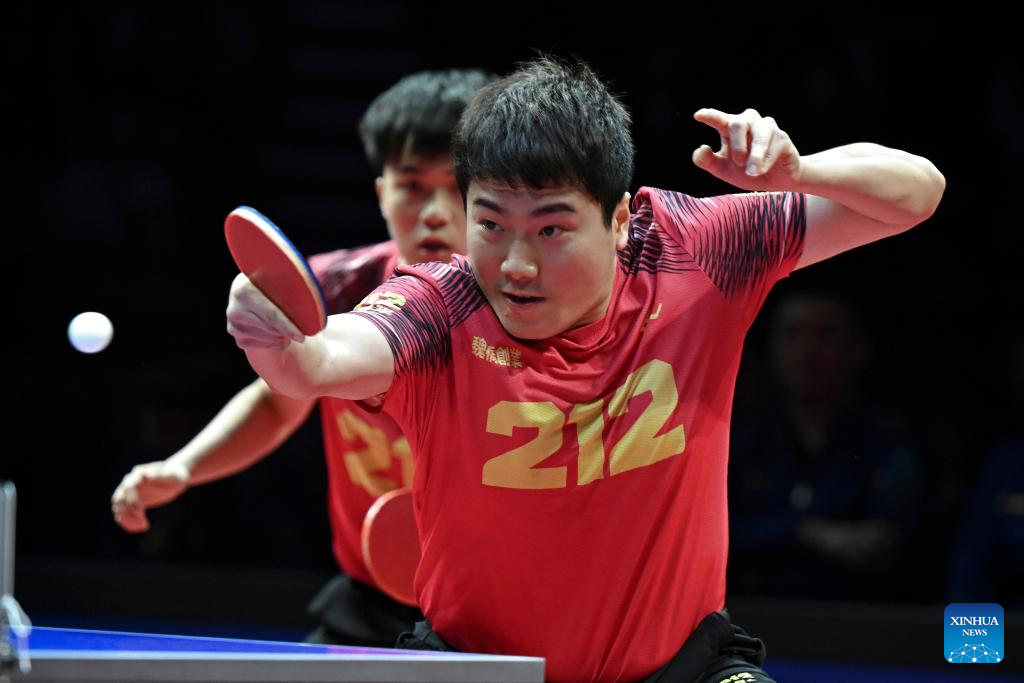 Lin Yun-Ju/Liang Jingkun (R) of Shandong Weiqiao compete against Xu Xin/Zhou Kai of Shanghai during the men's team semifinal at the 2024 Chinese Table Tennis Super League (CTTSL) in east China's Shanghai, Dec. 31, 2024. (Photo by Chen Haoming/Xinhua)
