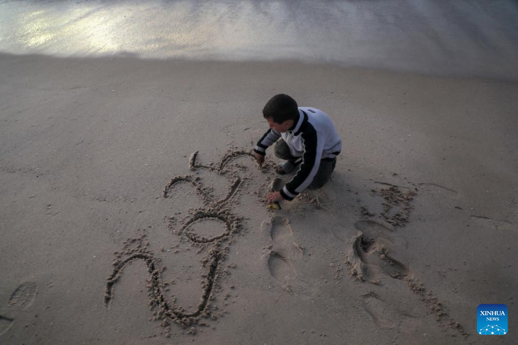 A Palestinian boy writes the number "2025" at a beach of Deir al-Balah in the central Gaza Strip on Dec. 31, 2024. (Photo by Rizek Abdeljawad/Xinhua)