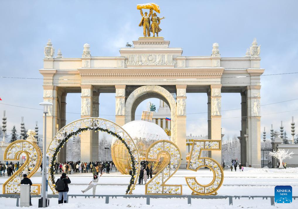 A woman poses for photos with New Year decorations in Moscow, Russia, Dec. 31, 2024. (Photo by Alexander Zemlianichenko Jr/Xinhua)