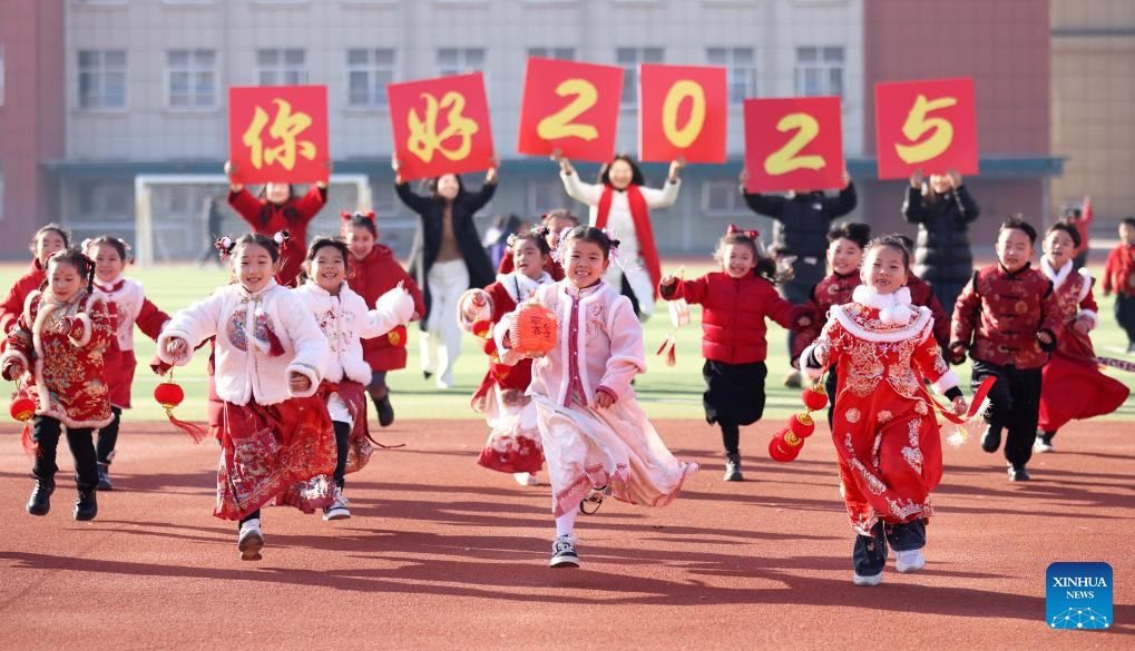 Children in traditional attire participate in an event welcoming the New Year at a primary school in Tancheng County of Linyi City, east China's Shandong Province, Dec. 31, 2024. (Photo by Zhang Chunlei/Xinhua)