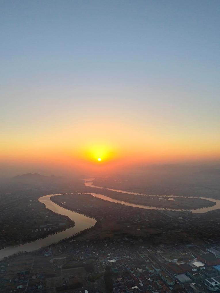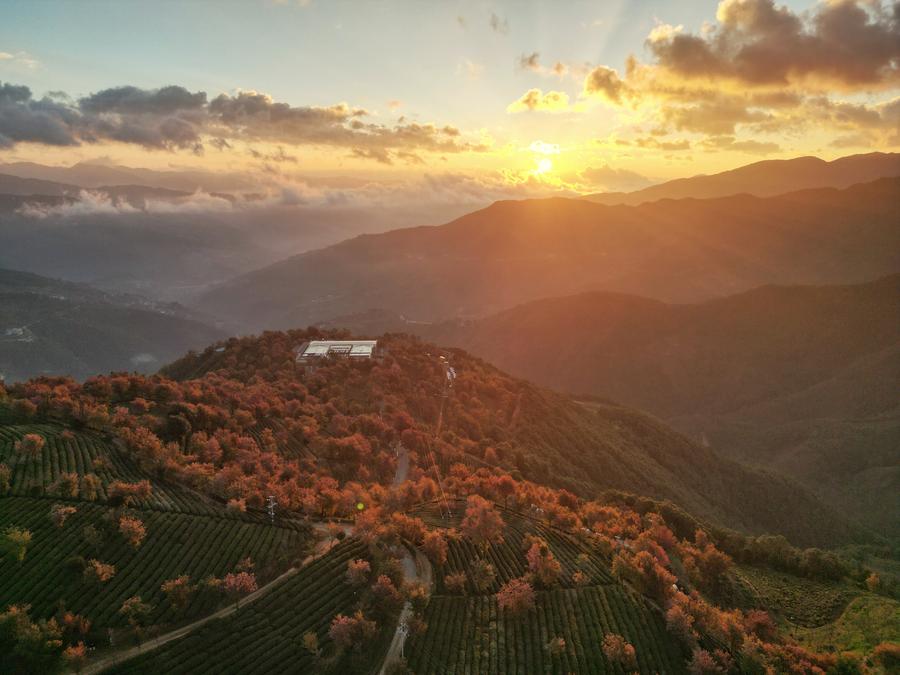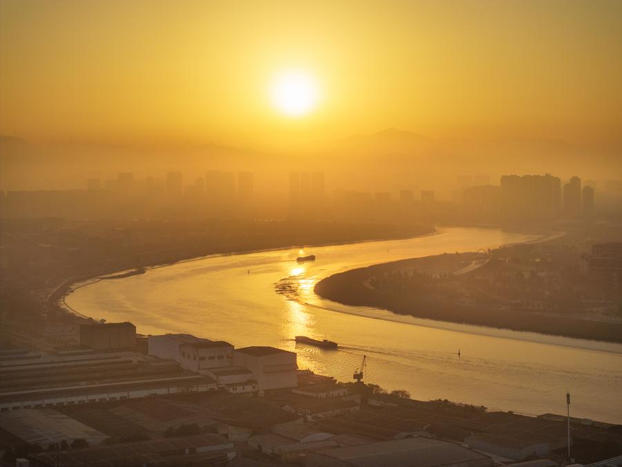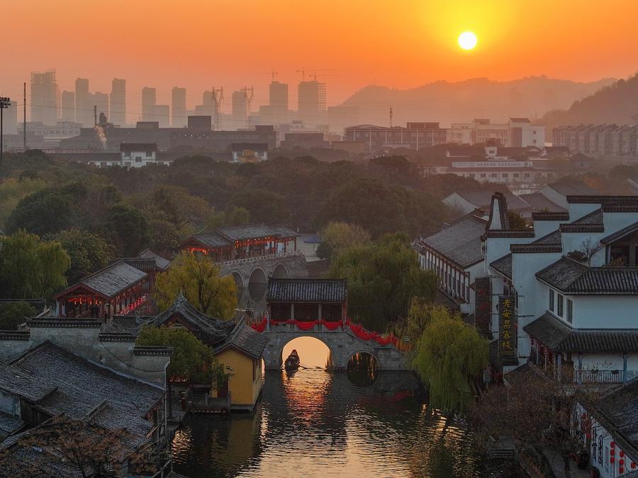 An aerial drone photo shows the sunrise scenery at Anchang ancient town in Shaoxing City, east China's Zhejiang Province, Jan. 1, 2025. (Photo by Gao Piaoran/Xinhua)