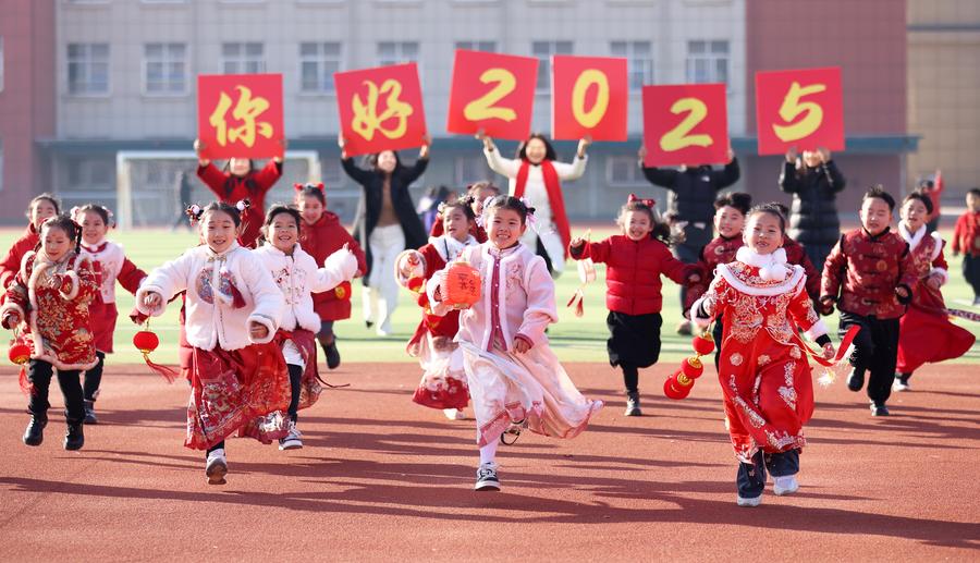 A grand national flag-raising ceremony is held at the Tian'anmen Square in Beijing, capital of China, Jan. 1, 2025. (Xinhua/Ju Huanzong)Fireworks illuminate the sky over Victoria Harbour in celebration of the New Year in Hong Kong, south China, Jan. 1, 2025. (Xinhua/Zhu Wei)Children in traditional attire participate in an event welcoming the New Year at a primary school in Tancheng County of Linyi City, east China's Shandong Province, Dec. 31, 2024. (Photo by Zhang Chunlei/Xinhua)A child interacts with an actor performing Bianlian or face-changing, a part of the Sichuan opera, during an event welcoming the New Year at a community in Huangpu District of east China's Shanghai, Dec. 31, 2024. (Xinhua/Fang Zhe)A woman poses for photos with New Year decorations in Moscow, Russia, Dec. 31, 2024. (Photo by Alexander Zemlianichenko Jr/Xinhua)Fireworks illuminate the sky in celebration of the New Year in Perth, Australia, Jan. 1, 2025. (Xinhua/Ma Ping)A Palestinian boy writes the number "2025" at a beach of Deir al-Balah in the central Gaza Strip on Dec. 31, 2024. (Photo by Rizek Abdeljawad/Xinhua)People take selfies during a New Year celebration in Vienna, Austria, Jan. 1, 2025. (Xinhua/He Canling)A worker operates at the workshop of Harbin Electric Machinery Company Limited in Harbin, northeast China's Heilongjiang Province, Dec. 31, 2024. (Xinhua/Zhang Tao)A passenger takes selfies aboard the bullet train G4408 on the Jining-Datong-Yuanping high-speed railway, Dec. 31, 2024. The Jining-Datong-Yuanping high-speed railway started operation on Tuesday. The railway line stretches from Jining in Inner Mongolia Autonomous Region through Datong to Yuanping, both in north China's Shanxi Province. (Xinhua/Yang Chenguang)An aerial drone photo taken on Dec. 31, 2024 shows a view of the Maerdang Hydropower Station in Hainan Tibetan Autonomous Prefecture in northwest China's Qinghai Province. All units of the Maerdang Hydropower Station, the highest-altitude facility of its kind on the upper reaches of the Yellow River, were connected to the grid in Qinghai Province on Tuesday. The station has a total installed capacity of 2.32 million kilowatts and is a major power provider in the "west-to-east power transmission" project. (Xinhua/Zhang Long)Lin Yun-Ju/Liang Jingkun (R) of Shandong Weiqiao compete against Xu Xin/Zhou Kai of Shanghai during the men's team semifinal at the 2024 Chinese Table Tennis Super League (CTTSL) in east China's Shanghai, Dec. 31, 2024. (Photo by Chen Haoming/Xinhua)People visit the Ponte Sant'Angelo in Rome, Italy, Dec. 30, 2024. (Xinhua/Li Jing)■